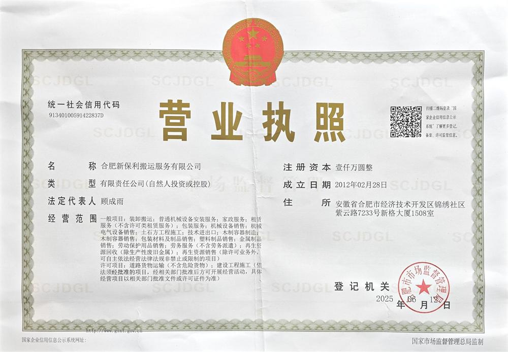 省時: 合肥新保利搬運服務有限公司 2012 年成立,注冊資金 1000 萬,總部位于合肥,設蘇州、成都分公司,業務覆蓋全國。